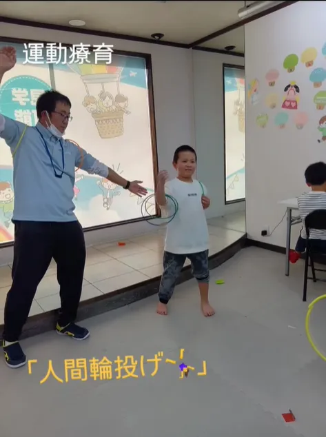 職員が「左手!」「右足!」と言いながら輪っかを投げ、声を聞いて指示された場所で輪っかをキャッチしていきました!