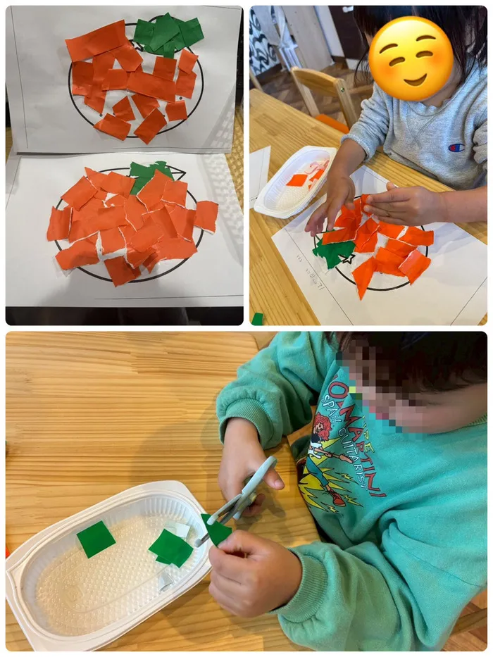 今回は【ちぎり】と【はさみで一回切り】でみかんの貼り絵をしました💡