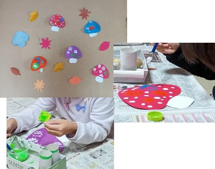 絵の具を使うプログラムは久しぶりでしたが、みんなとっても集中して取り組んでくれて、色とりどりの素敵なキノコが完成!
