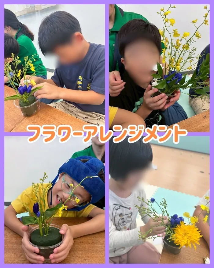 お花を見ると、自然と子どもたちが集まってきて、普段は参加しない子も積極的に参加し、思い思いに個性溢れるアレンジメントを作りました✨🌸