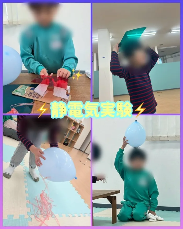 実験を通して、こどもたちは、「これは静電気できるかな?」「他に実験できるものはないかな?」など、いつもと違った視点で静電気探しを楽しみました♫