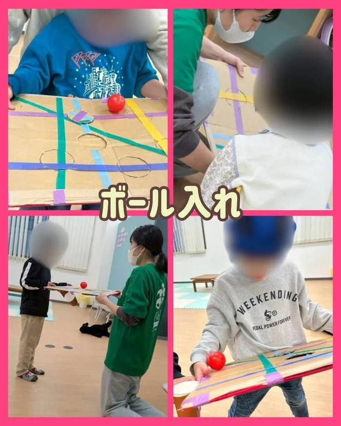 準備ができたら、ゲームスタート✨段ボールの上にボールをのせて、両手で落ちないようにコントロールしながら、紙コップにボールをイン👀