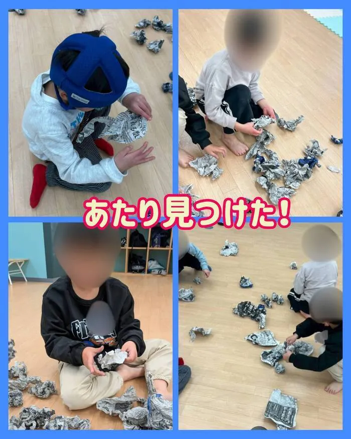 くしゃくしゃに丸めた数多くの新聞紙を床に置いて、その中からあたりを見つけるゲームです🌟
