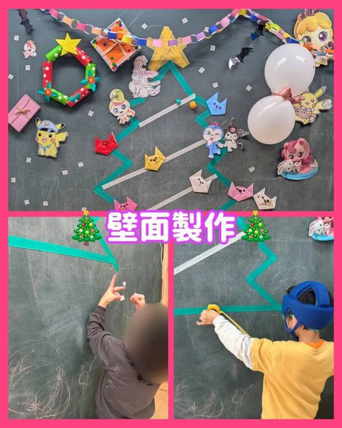 折り紙や、シール、テープなどを使ってクリスマスリースやツリーを作り、壁一面が華やかに彩りました✨