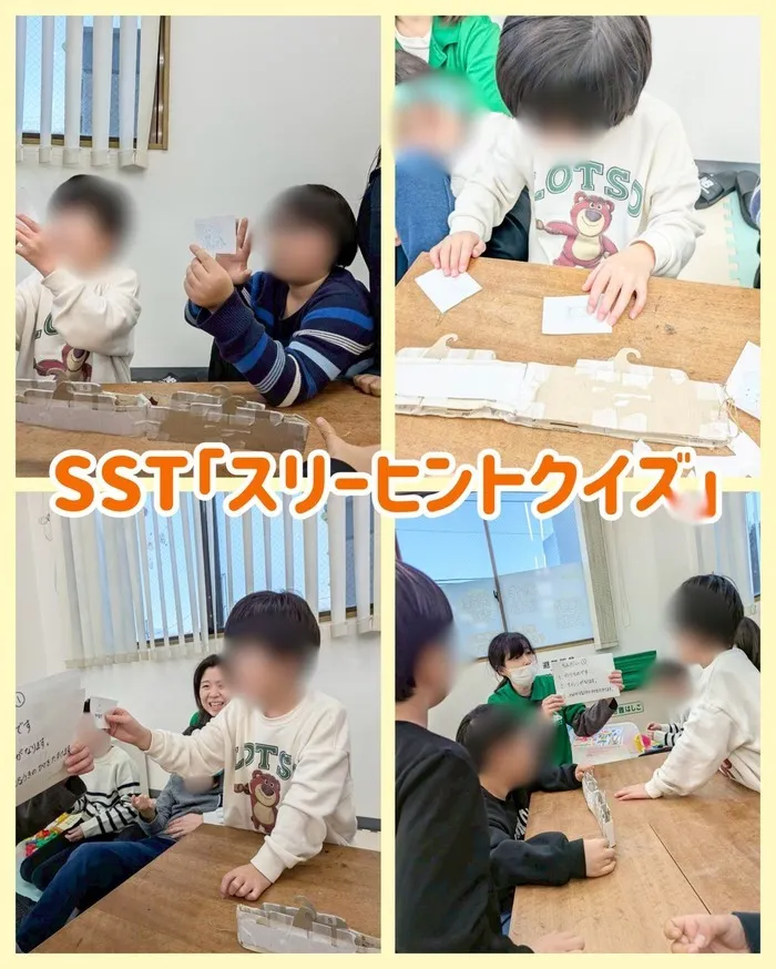 今日の活動はソーシャルスキルトレーニングとして、脳をフル回転させる『スリーヒントクイズ』を行いました!