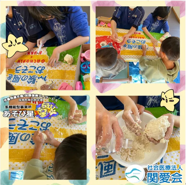 小麦粉粘土が出来上がると、型抜きをを使ってみたり粘土ヘラを使って思い思いに楽しむ姿が見られました(^^)♪