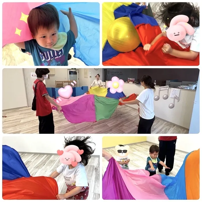 普段触る機会があまり無い為子どもたちはパラバルーンを持つと、バタバタバター!!と動かすのを楽しみ、潜るとカラフルな模様に目を輝かせていました🤣✨