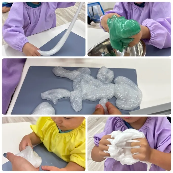 まぜていくうちにトロトロからぷにぷにに変わる感触に、「かたまってきた!」「のびた〜!」と夢中な子どもたち☺️