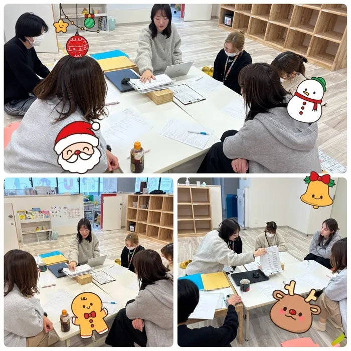 「この子にはどんな関わりが合っているかな?」「もっと伸ばしていける部分はどこだろう?」など、ひとりひとりの姿を思い浮かべながら意見を共有し、より良い支援につなげていけるよう確認しました!