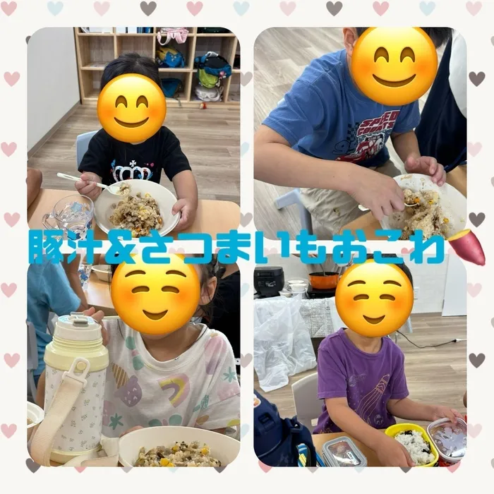 さつまいもが苦手なお子さんも多く最初は「さつまいもかー、、、」と不安そうな様子でしたが、おこわやお味噌汁に入ると美味しかったのかたくさん食べてくれました!