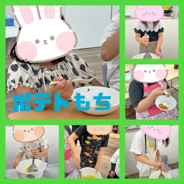 レンジでチンしたじゃがいもをしっかりつぶして、材料を混ぜ、みんなで1つ1つ丸め、小判形にしました✨手にじゃがいもがくっついてしまうこともありましたが、上手にできましたよ😊