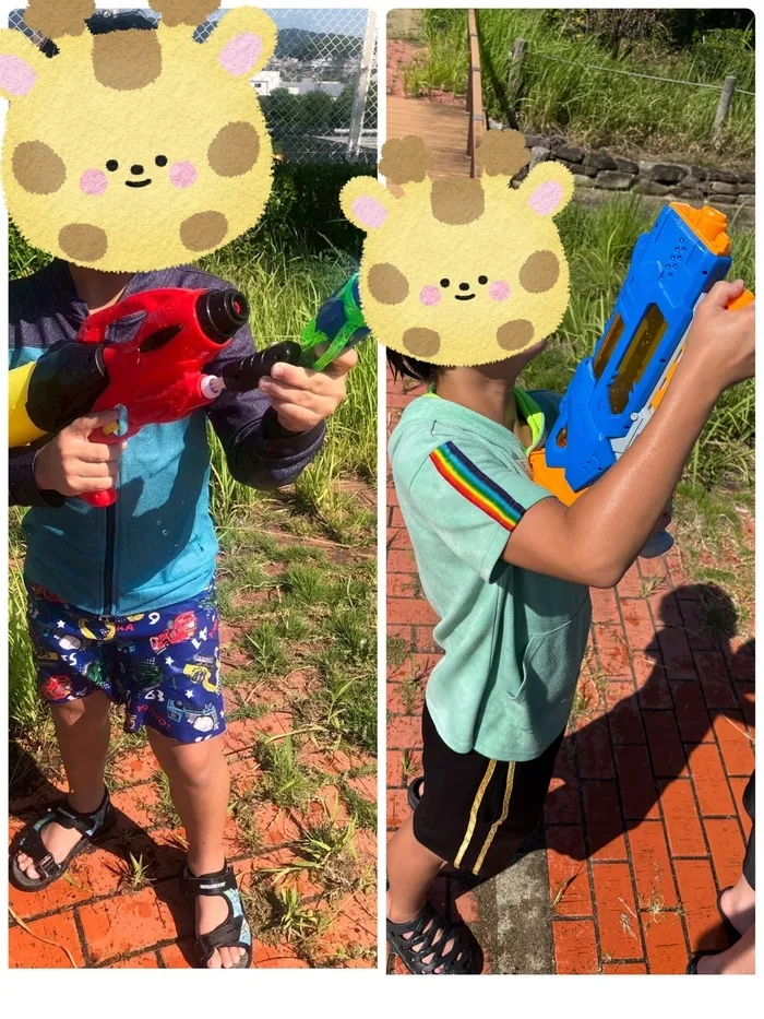 職員やお友達に水を当てたりペットボトルに水を入れて掛け合ったりして、沢山水を浴びて楽しみました🌟
