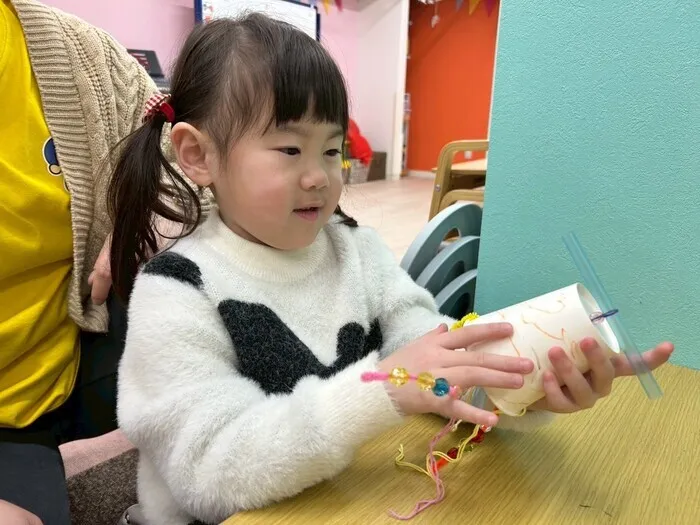 紙コップの穴に紐やモールを通したりビーズに輪ゴムを通したり、細かい作業が多い工作でしたが、指先を上手に使い、完成させることができました✨