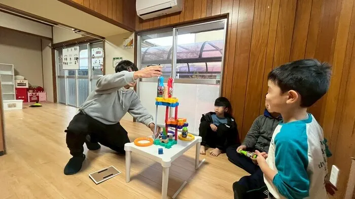 チームで協力しながらブロックやカップを順番に積み上げていく、楽しく体を動かす活動です。