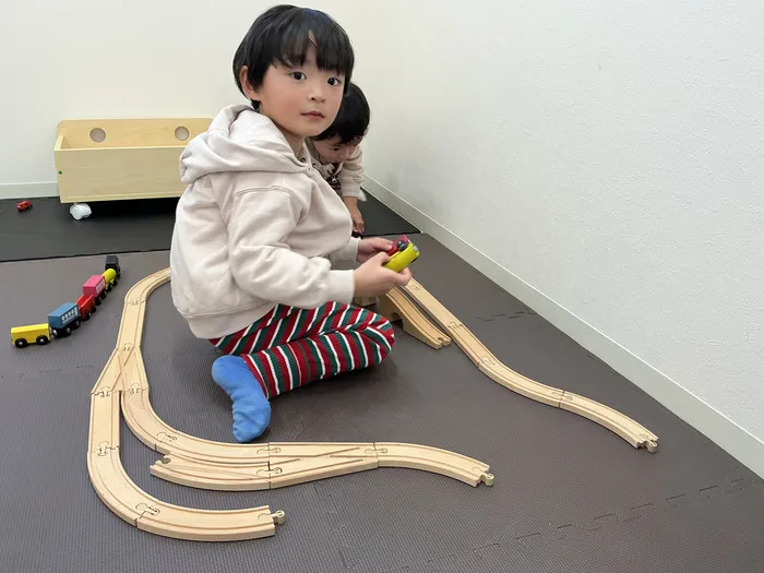 レールをつなげて電車を走らせたり、「ここ通るよ」と伝え合ったり🚃