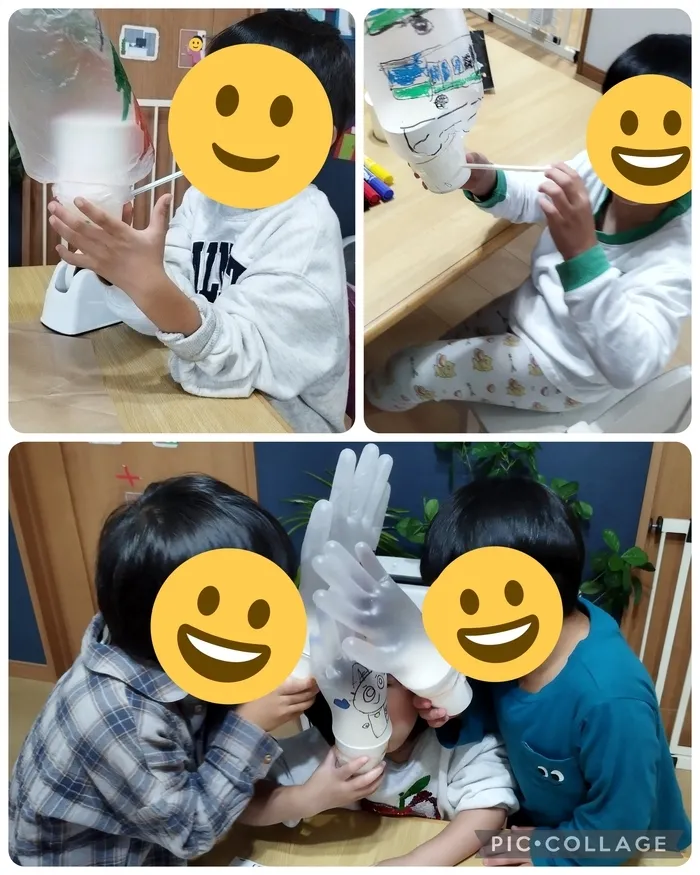 ストローを付けてみんなでてぶくろおばけのお披露目では、息を吸ったり吐いたりしながら、紙コップから動く様子をリアルに表現していました。