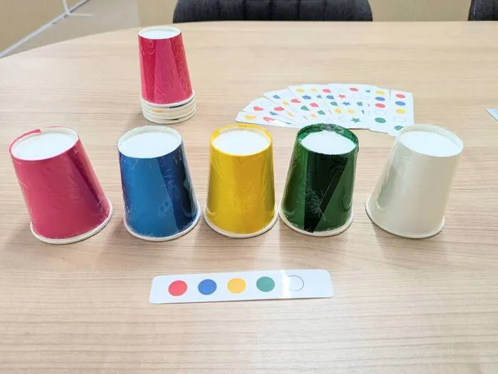 カードに描かれた色の並び順を見て、同じ順番でカラーカップを並べるだけ!
