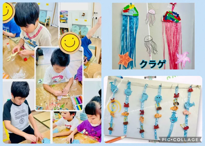 ・青いビニールテープに、魚たちが泳いでいるよ!クレヨンで描いたり、シールを貼って表現🐠