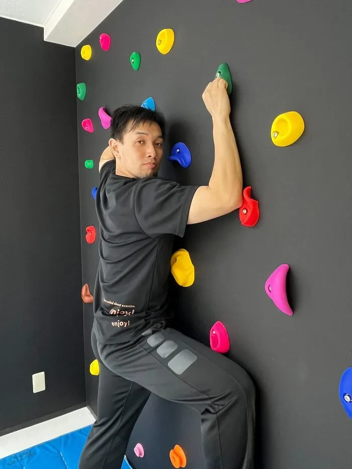 リィでは療育中に、コーチと一緒にボルダリングを「よいしょ。よいしょ。」と登ったり、ボールを「えいっ!」と投げたりします🥎