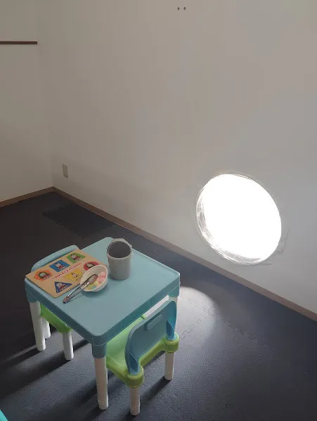 個々での課題に合わせて、保育士、指導員と1対1での活動をおこなっていき、楽しんで取り組んでもらえるように、個別の部屋に入るのに、扉だけではなく、壁に丸い穴を開けて、秘密の扉を作りました(^.^)