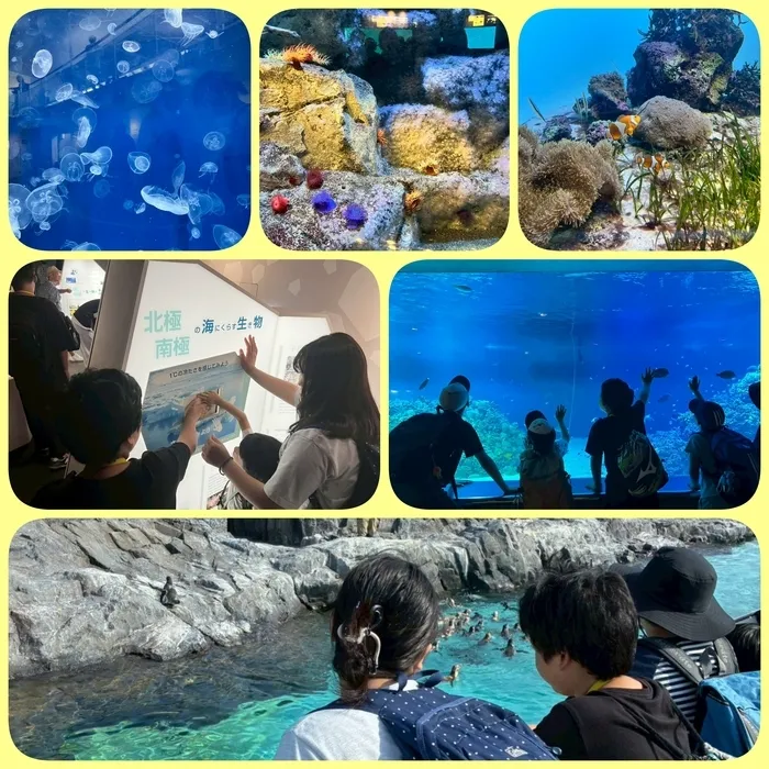 館内では、大きな水槽で泳ぐマグロや、かわいらしいペンギンを見て子どもたちは大興奮!「おっきい!」「かわいい!」など、思ったことを口にしながら楽しむ姿がたくさん見られました。クラゲやカラフルな魚の前では、じっと眺めて落ち着いた表情を見せるお子さんもいました。🐧🐡