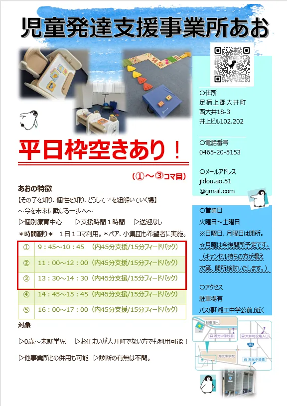 今後、利用待ちの方(空きが無く利用待ちの方)が増えてきた際には、『月曜日』の開所を検討しております!一先ず、見学と無料でのあおの支援体験だけでもお越しいただけたらと思います😌