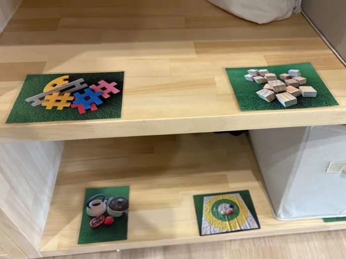 ハニカムでは、子どもたちが自分でおもちゃの整理整頓ができるよう、おもちゃの棚に写真を張り、片づけ場所を分かりやすくしています。