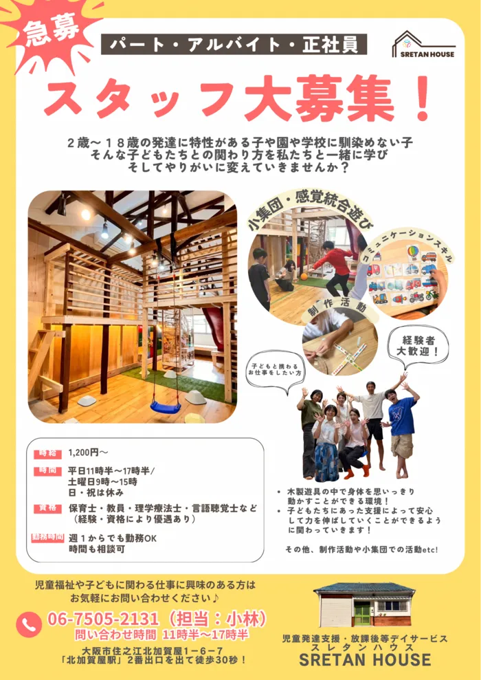 スレタンハウスは、2歳〜18歳の発達に特性があるお子さんや、学校に馴染めない子どもたちと深く関わり、一緒に学び、やりがいを創っていく場所です。