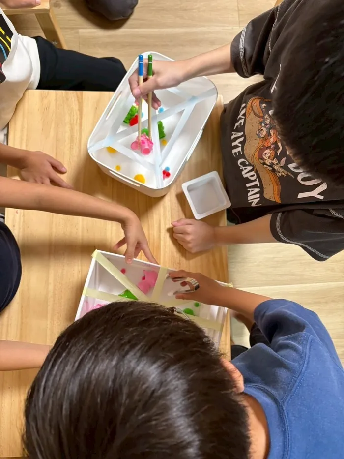 • 集中力を養う工夫: カゴのテープをクモの巣に見立て、中のおもちゃをトングなどで取り出すオリジナルゲーム。指先を慎重に動かすこの**【挑戦】**は、食事や学習に必要な集中力を大きく伸ばします。