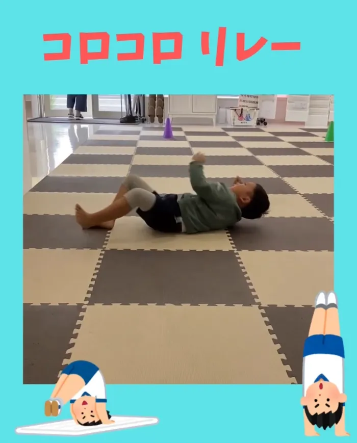 今日の活動は、みんなで「コロコロリレー」!🏃💨 横になって、手足を使わず全身を回転させて進むゲームに挑戦しました!