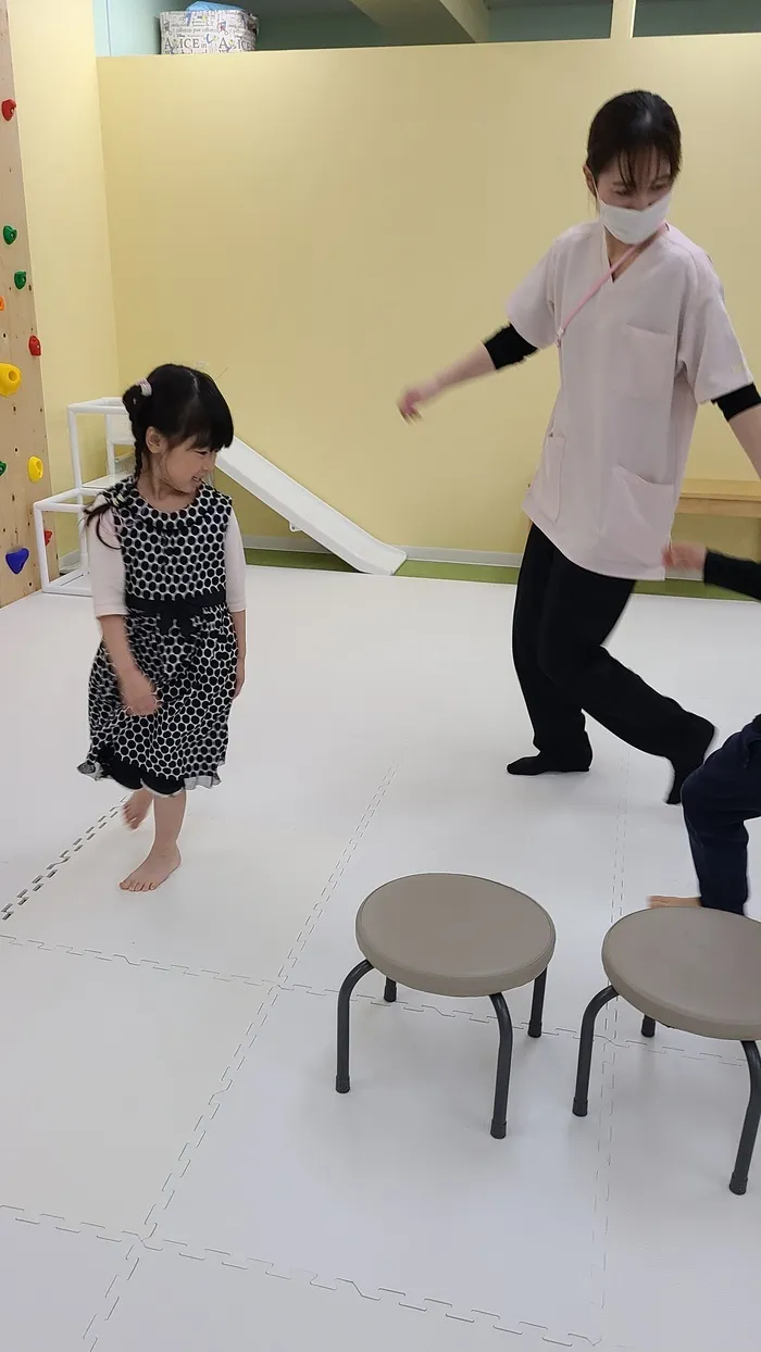 音楽に合わせて歩いたり、止まったら椅子に座ったりと、みんな集中して取り組むことができました❗同じ椅子に座ってしまった時には、じゃんけんをして座れる人を決めることもできましたよ🙌