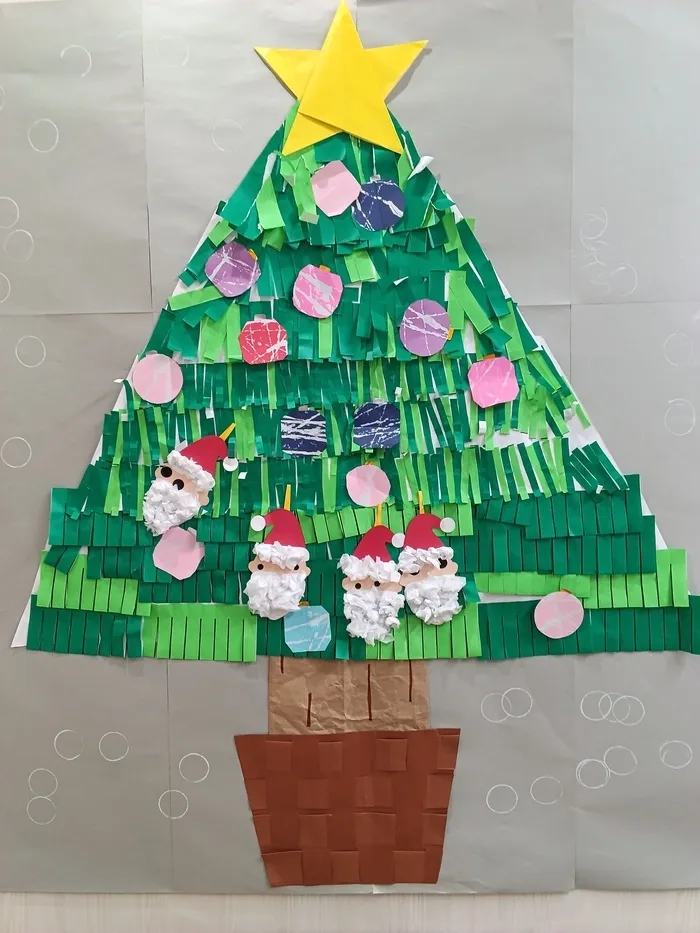 ちぎり方・切り方で一人ひとりの個性が出ていて、見ているだけでも楽しいツリーになっています。