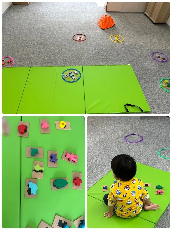 パズル色の弁別マッチングを行いながら、フープまでの距離や位置を確めるビジョントレーニングをしながらを動くことで、 “空間の位置や関係” のしっかり把握していきます。