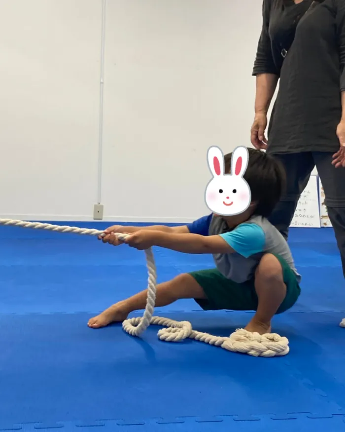 先日の児童発達クラスでは、みんなで「綱引き」に挑戦しました。
