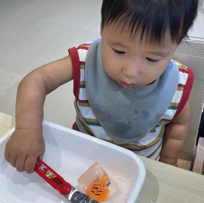 氷遊びでは、「冷たい!」という体験と、スプーンを下手持ちや3指持ちでの操作の練習をしました!!🥄