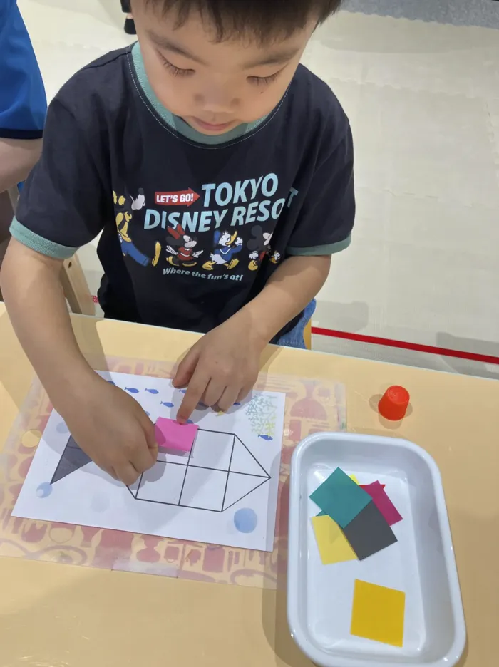 四角と三角の形を枠に当てはめてカニや魚、ヨットなどを完成させました!