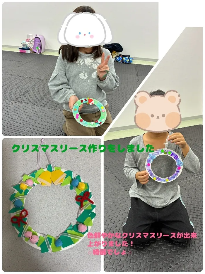 工程ひとつひとつを丁寧に進めることで、指先を使った細かな動きや色の組み合わせを考える力も育まれ、個性豊かなリースが完成しました。