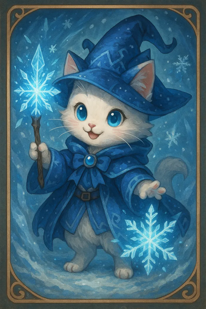 今回は「白猫」「性格はキュート」「氷の魔法つかい」「カードゲーム風」と入力したことで、とても可愛らしいオリジナルキャラクターが完成しました🎉