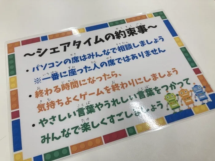パソコンやゲームの席は「早い者勝ち」ではなく、みんなで相談して決めること。終わりの時間になったら気持ちよく切り替えること。そして「ありがとう」「どうぞ」といったやさしい言葉を使うことです。