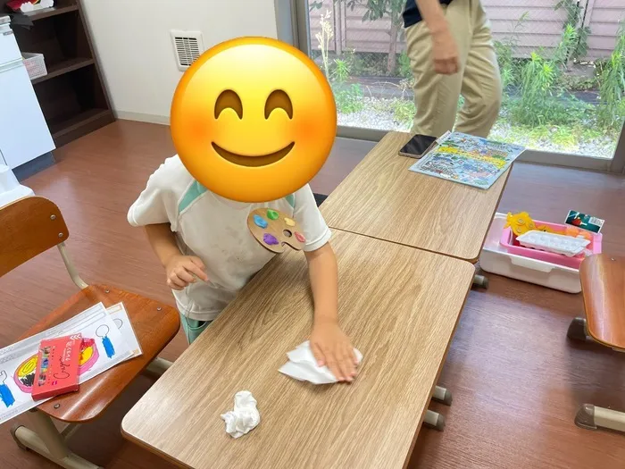 色とりどりのクレヨンで楽しく作品を描いたあと、机に少し付いたクレヨンのお掃除タイムです✨