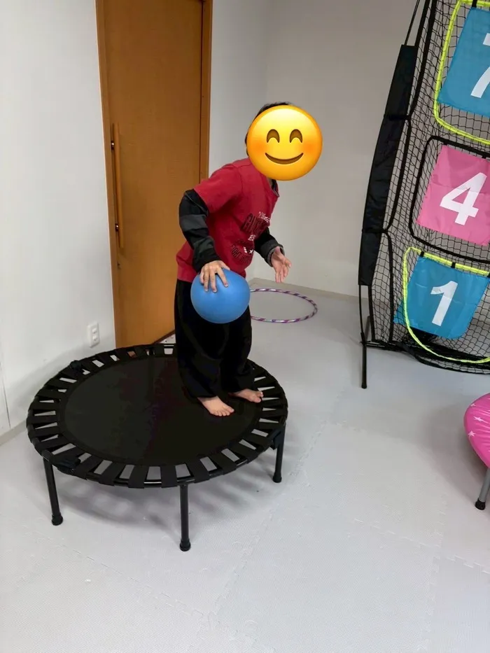 跳ねる揺れをコントロールしつつ、しっかりとボールに集中してキャッチすることで、体幹・バランス感覚・反応速度が同時にトレーニングできる万能あそびです!