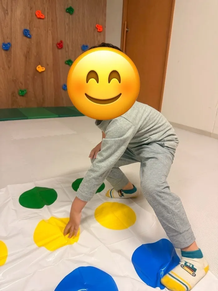 カラフルなマットを使って、手と足を指定の色に置きながらバランスをとる遊びをしました💡