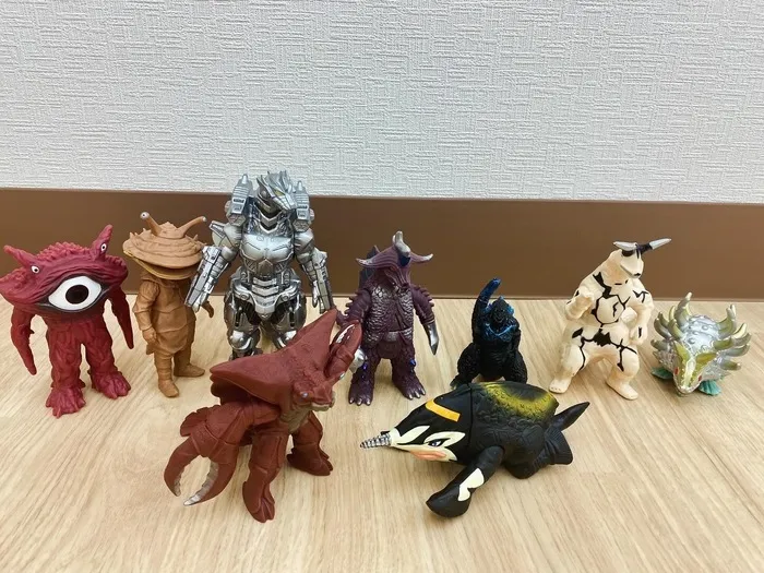 いろいろな怪獣のおもちゃと、音の出るピアノのおもちゃが