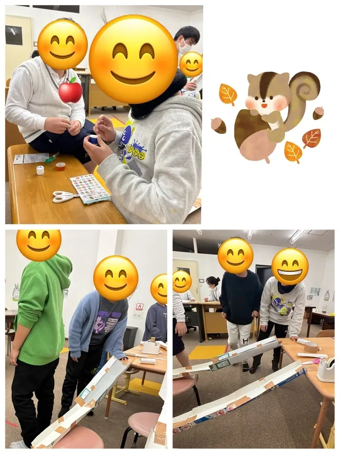 スタッフが用意した見本の道を参考にしながら、子どもたちが道作りを始めました。トイレットペーパーの芯を細く切ってつなげ、カーブの道を作ることに集中していたお兄さん、低学年の子は「学校でやったよ!どんぐりころがしたよ。したにカップをつけたんだよ」と、それぞれアイデアを教えてくれました。