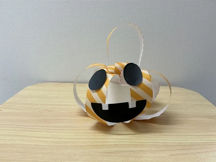 紙コップをベースに、オレンジ色の紙や切り抜いた顔パーツを貼って、カボチャのおばけポットに変身させました。