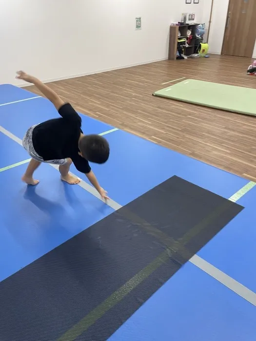 昨日の活動では、子どもたちが側転に挑戦しました。両手を床につき、思い切って足を振り上げるその姿はとても勇ましく、「できた!」と声を上げた瞬間の笑顔は最高でした✨ 仲間の挑戦を見て「ぼくもやってみる!」と気持ちが高まり、良きライバル関係が生まれていました。側転は体のバランス感覚や空間認識力を育てる動きでもあり、繰り返すうちに体幹の安定も養われていきます。失敗してもあきらめず、笑い合いながらまたチャレンジする姿から、運動そのものを楽しんでいることが伝わってきました😊 KID’S BASE2での「できた!」の積み重ねが、子どもたちの大きな自信につながっています。