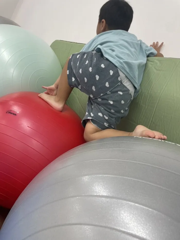 体幹は姿勢や動きの基礎となる大切な部分です。バランスボールは不安定な面に座るだけで自然と体幹が刺激されます。KID’S BASE2では、ボールに座る、手をつく、うつ伏せになるなど多様な運動を取り入れ、遊びながら体幹を鍛えています。体幹が安定すると、転びにくくなったり、動作がスムーズになったりと日常生活にも良い変化が表れます。