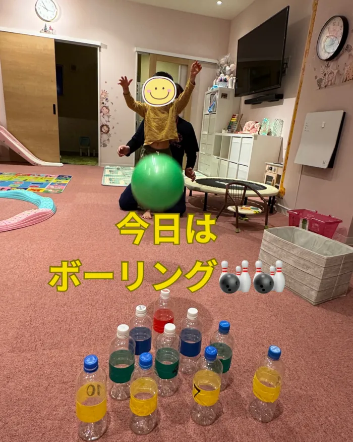 今日の支援は5領域の中の運動・感覚として、ペットボトルボウリングをしました。ルールを守ることや、ねらいをつけてボールを転がすこと、力加減を身に着ける事を目的としました。