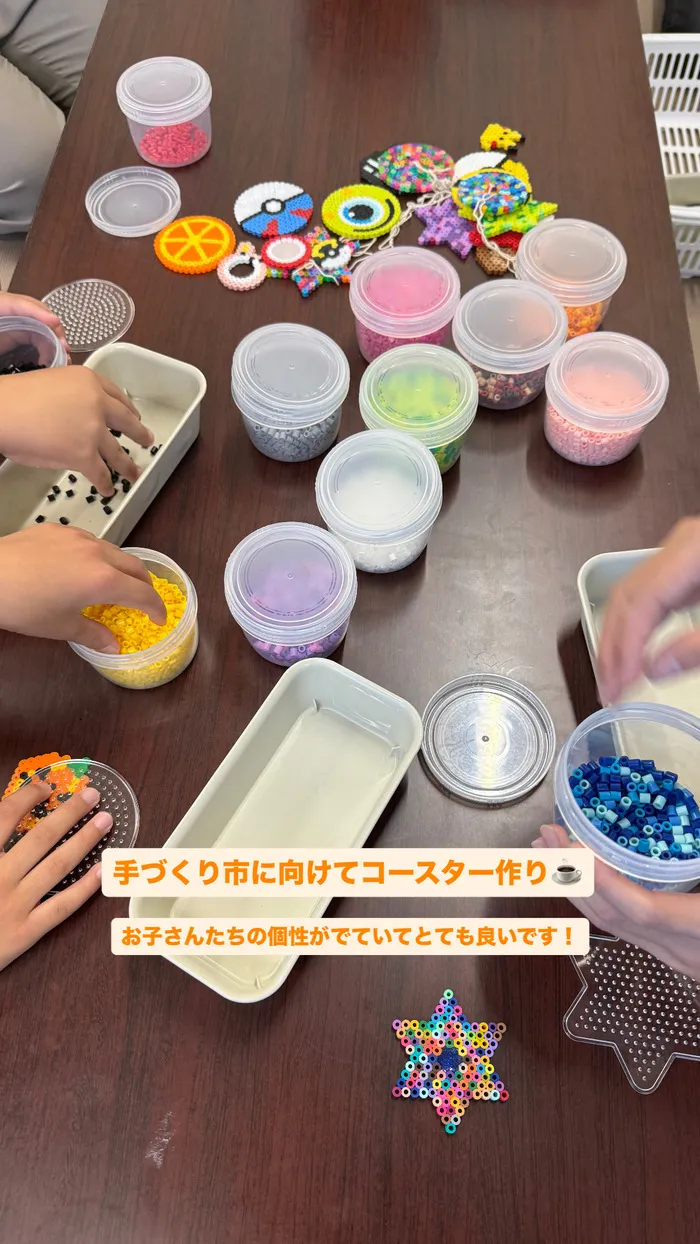 今回の活動では、今月開催される「手づくり市」への出店に向けて、アイロンビーズ作品の制作に取り組みました!