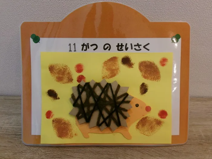 ハリネズミのトゲを毛糸でまきまき、スポンジスタンプで落ち葉をペタン!